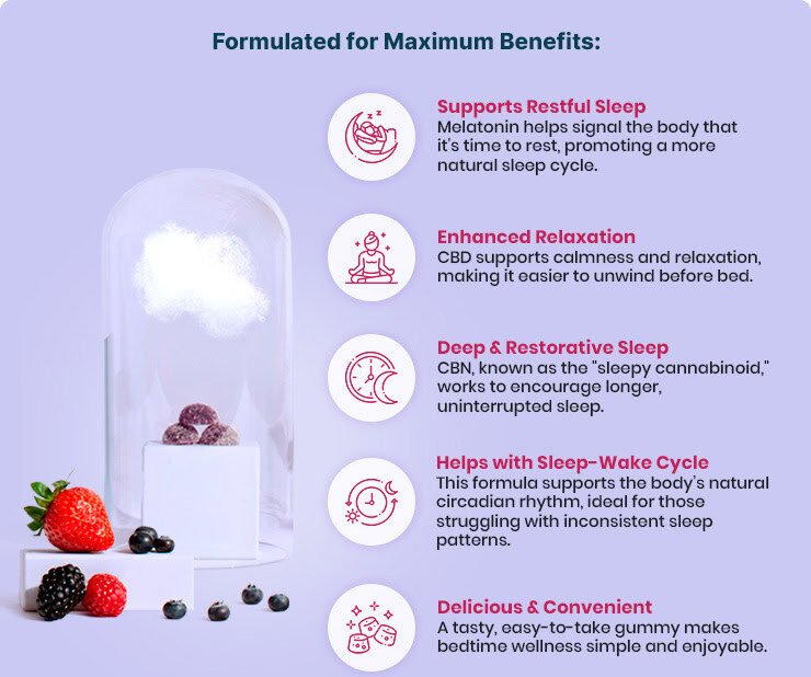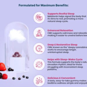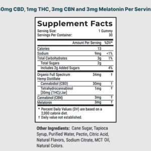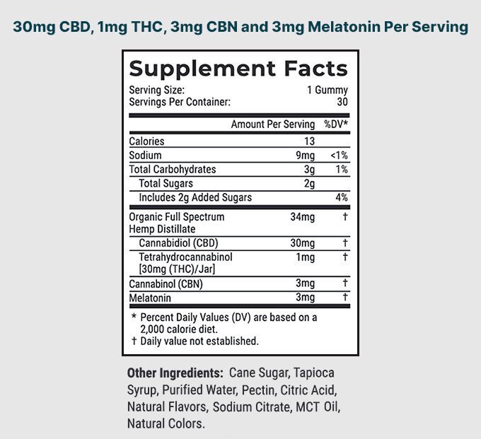 Each bottle contains 30 gummies, with 30mg of CBD, 3mg of CBN, and 1mg of THC per gummy. These vegan, gluten-free gummies are made with USA-grown, non-GMO hemp and are free from corn syrup. Each serving offers a balanced combination of cannabinoids and melatonin to improve sleep quality and support restful sleep.