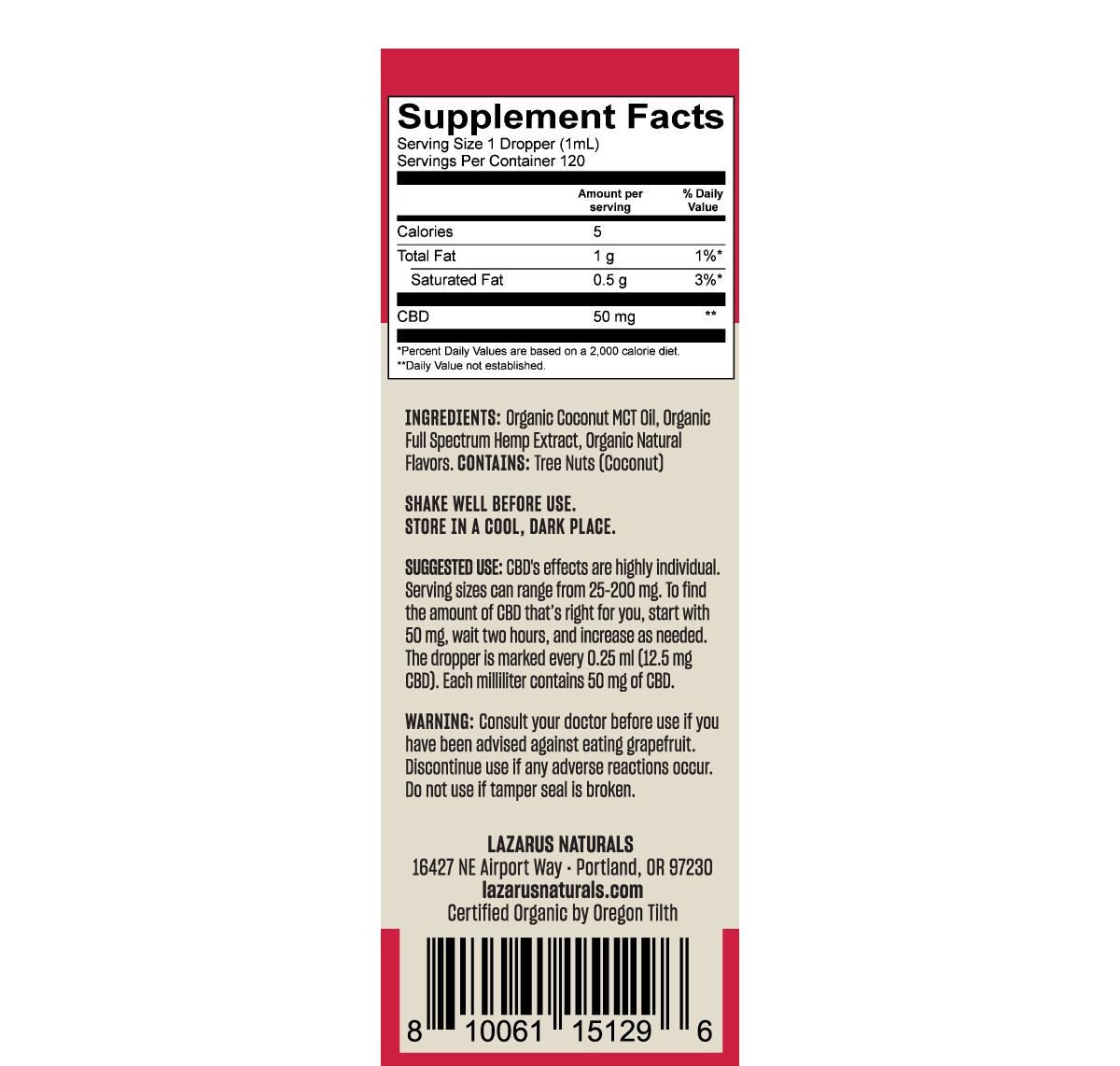 CBD’s effects are highly individual. Serving sizes can range from 25–200 mg. To find the amount of CBD that’s right for you, start with 50 mg, wait two hours, and increase as needed. The dropper is marked every 0.25 ml (12.5 mg CBD.) Each milliliter contains 50 mg of CBD.